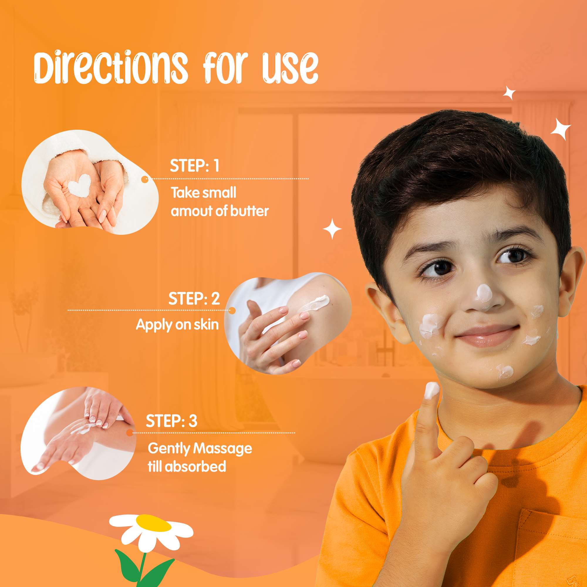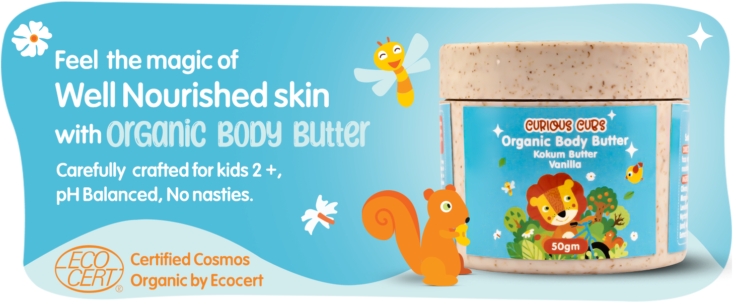 Experience the ultimate in gentle skincare with Curious Cubs Organic Body Butter, tailored for children aged 2-12. This Organic body butter combines Kokum Butter and Mango Butter for Deep Nourishment with Organic Vanila Extracts for Soothing the skin and Organic Almond Oil and Organic Jojoba Oil offering Hydration. The calming blend of Organic Flower Extract and Organic Night Jasmine Essential Oils adds a soothing, delicate fragrance that turns each application into a relaxing ritual. Free from artificial ingredients, Curious Cubs ensures your child’s skin stays velvety, healthy, and wonderfully soft.