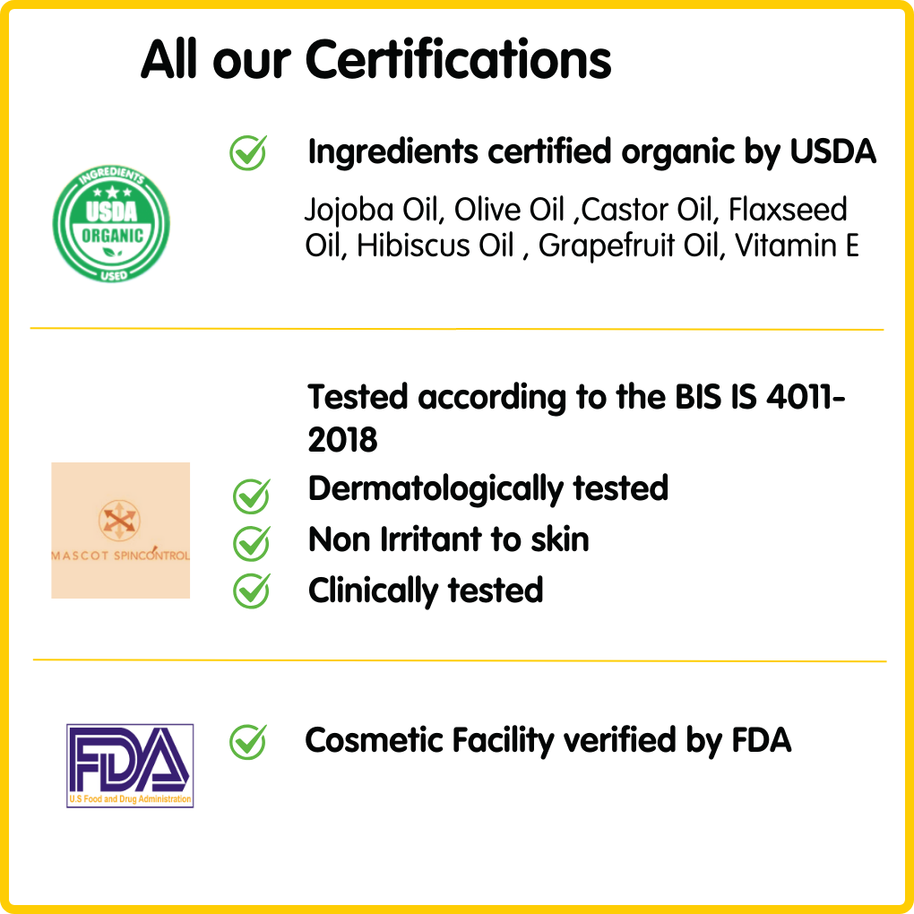 Simmondsia Chinensis Oil*, Ricinus Communis Oil*,Olea Europoea Fruit oil*,Hibiscus Sabdariffa Oil*,Linum Usitatissimum oil*, Citrus Paradisi Oil*,Tocopherol