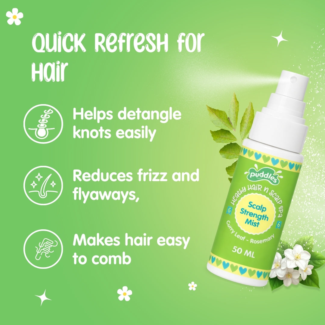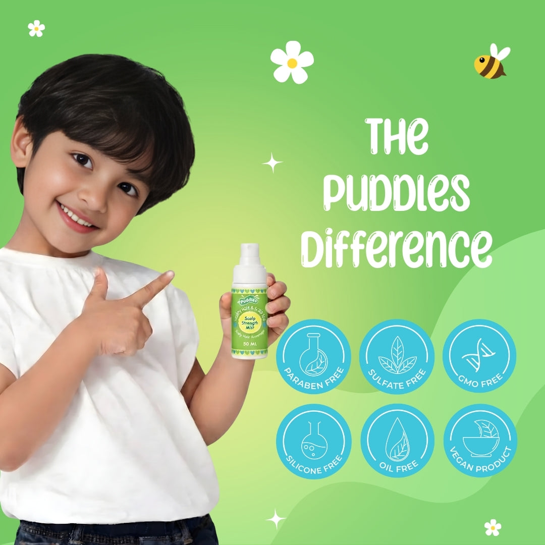 The Puddles Kids Scalp Strength Mist turns everyday hair struggles into stress-free moments. It’s the perfect quick-fix for school mornings, post-play tangles, and bedtime grooming—helping moms keep kids’ hair neat with minimal effort.